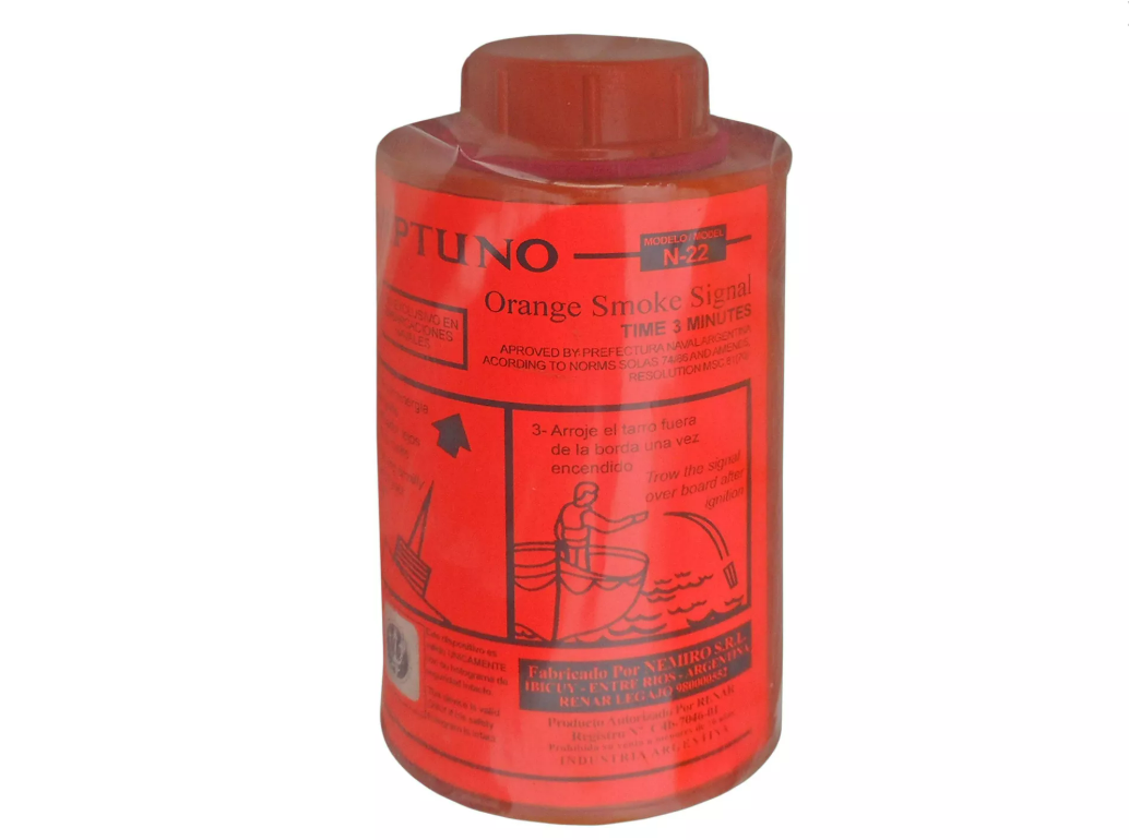La bengala de humo anaranjado de Neptuno es un elemento de seguridad reglamentario de uso exclusivo en embarcaciones. Industria Argentina, aprobación de la Prefectura Naval Argentina, vigencia de 2 años desde la fecha de fabricación (según partida). Duración de 3 minutos.