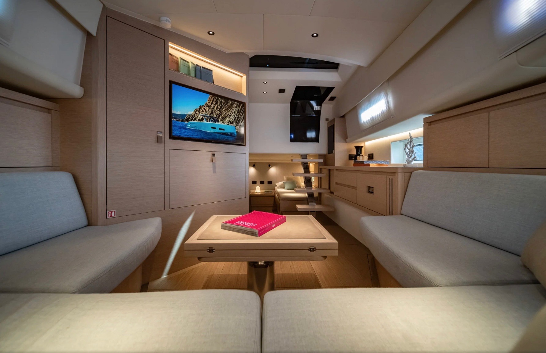 El interior del modelo también refleja el estilo refinado del astillero, con materiales de alta calidad, terminaciones cuidadas y una distribución que prioriza el confort. La cabina ofrece espacios bien aprovechados que permiten disfrutar de estadías a bordo con un nivel de habitabilidad destacado para su eslora.