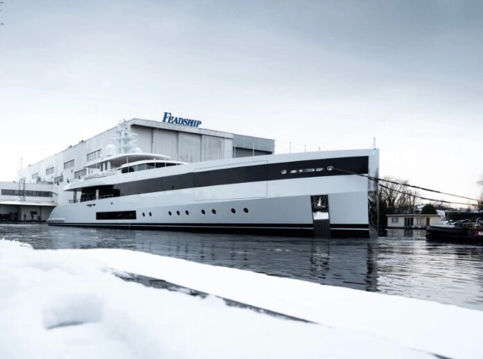 Feadship presentó por primera vez el exterior de su Proyecto 717, un yate de 49,50 metros de eslora, al salir de la nave de construcción en sus instalaciones de Aalsmeer