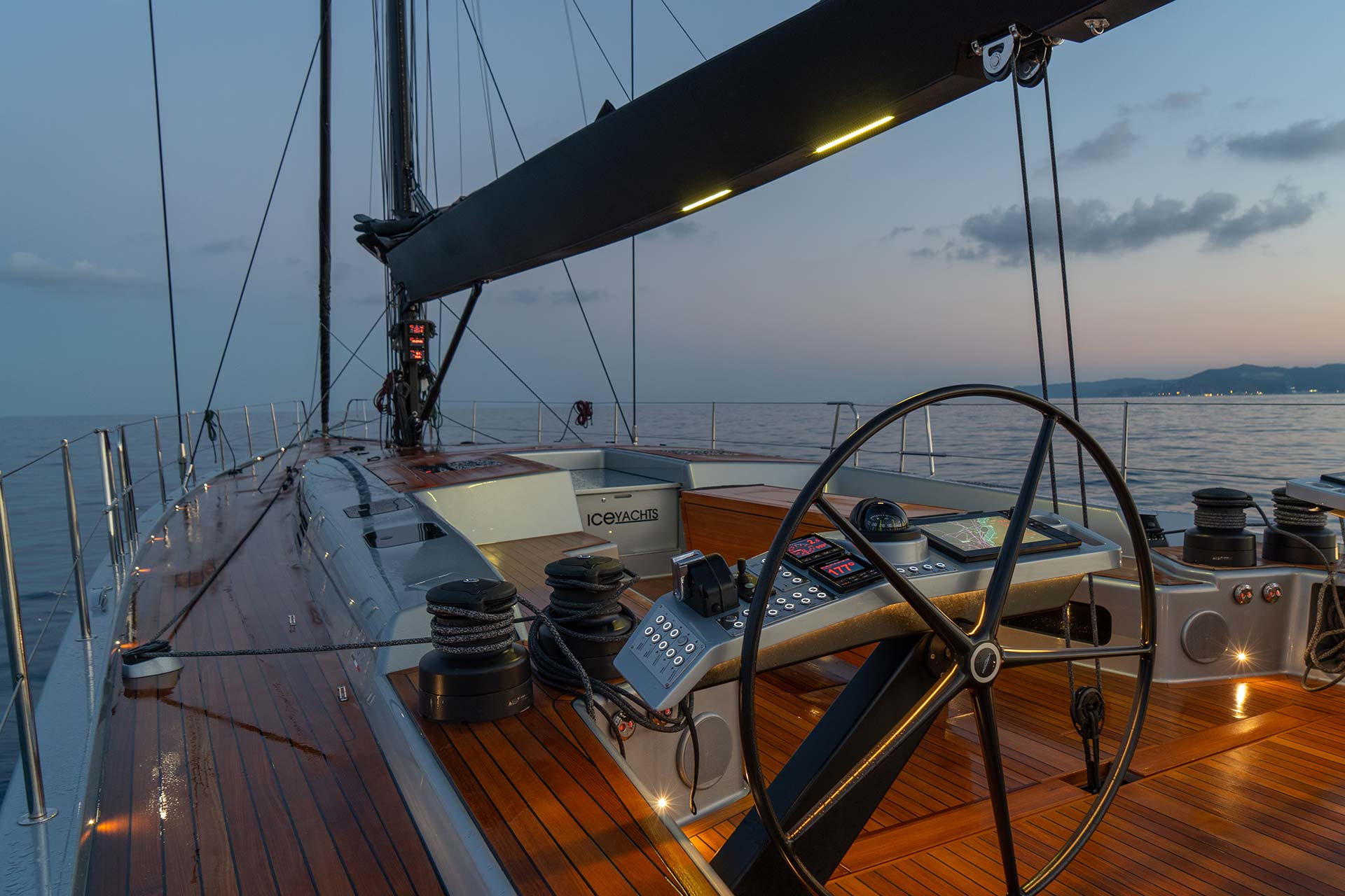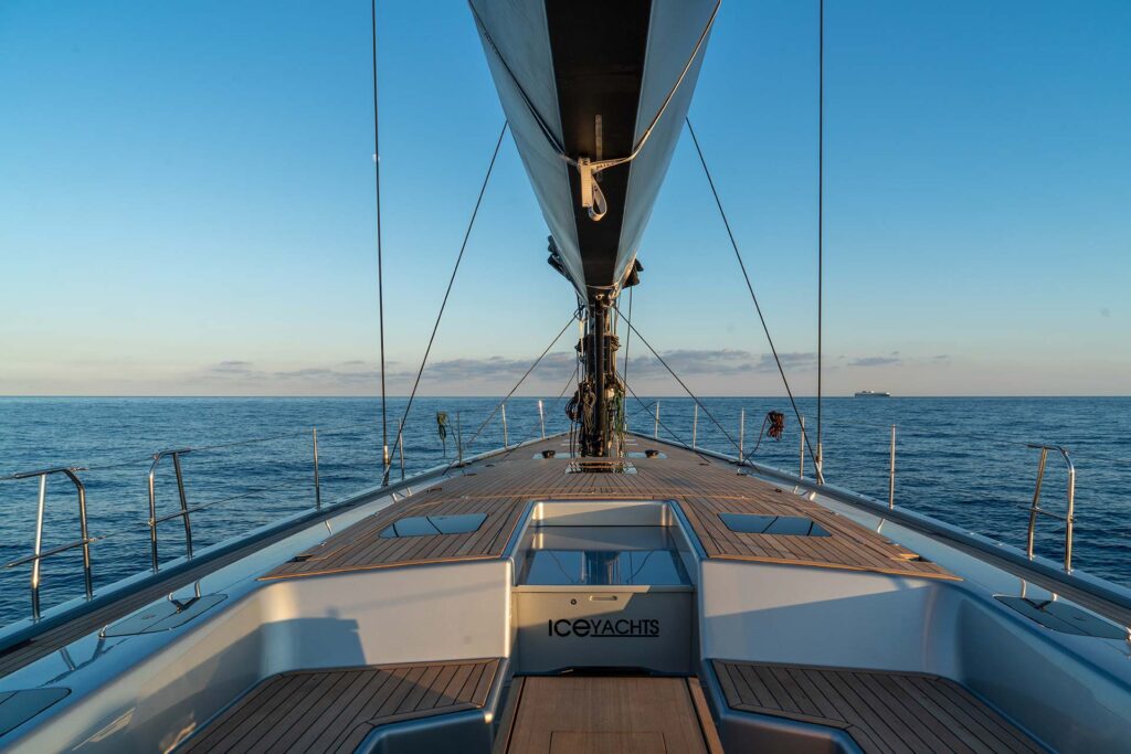 La cubierta, recubierta con teca natural de 10 mm, combina deportividad con elegancia clásica. Su disposición, limpia y funcional, responde a la filosofía del diseño original del ICE70: ergonomía, practicidad y facilidad de maniobra, incluso con una tripulación mínima. Cada detalle ha sido pensado para garantizar una navegación segura y ágil, tanto en regatas como en travesías de largo alcance.