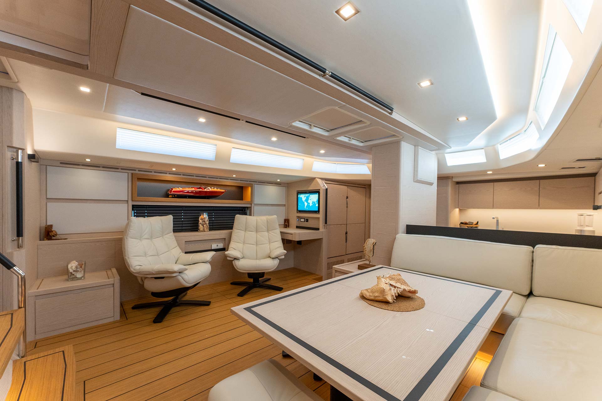 En la dinette, una pantalla táctil de 24 pulgadas ofrece control integral de los sistemas de navegación, iluminación, climatización y otros servicios a bordo.