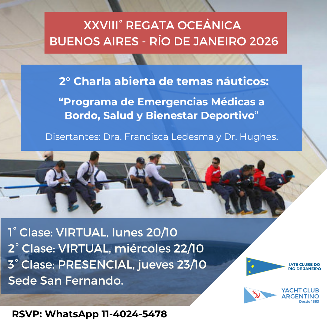 El Club Náutico Argentino invita a participar de la segunda charla abierta de temas náuticos, titulada “Programa de Emergencias Médicas a Bordo, Salud y Bienestar Deportivo”, un espacio destinado a preparar al navegante en la prevención de siniestros, la optimización del rendimiento deportivo y la gestión efectiva de una emergencia médica en el agua.