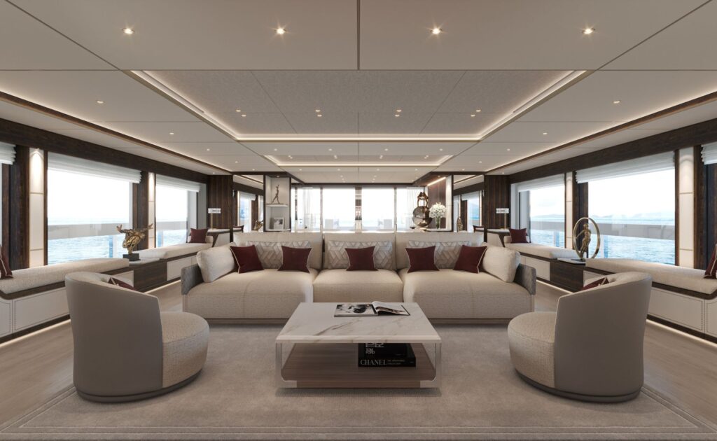 Los interiores —concebidos por el Departamento de Estilo de Sanlorenzo— materializan un enfoque donde la precisión técnica se integra con una estética depurada. La paleta cálida combina maderas oscuras, mármol Calacatta Borghini, detalles en nácar y acabados en champán, dando lugar a un ambiente de lujo sobrio y equilibrado.