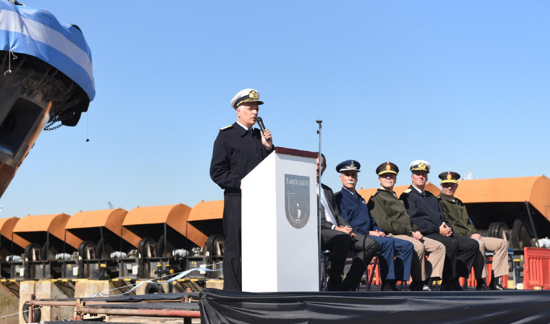 A continuación, las autoridades pronunciaron palabras alusivas. En primer lugar, el Presidente del Astillero Tandanor, Ing. Tomás Etcheverry, ponderó la botadura como un hito para la industria naval argentina: “La embarcación es de diseño y desarrollo íntegramente propios y representa la culminación de un intenso proceso de ingeniería y esfuerzo colectivo”, agregó que la unidad fue concebida para operar en el ámbito portuario con una capacidad de tiro a la bita de 40 toneladas, “lo que le permitirá asistir a buques de diversos portes bajo estándares de habitabilidad adecuados para su tripulación”.