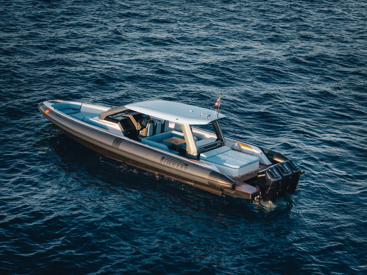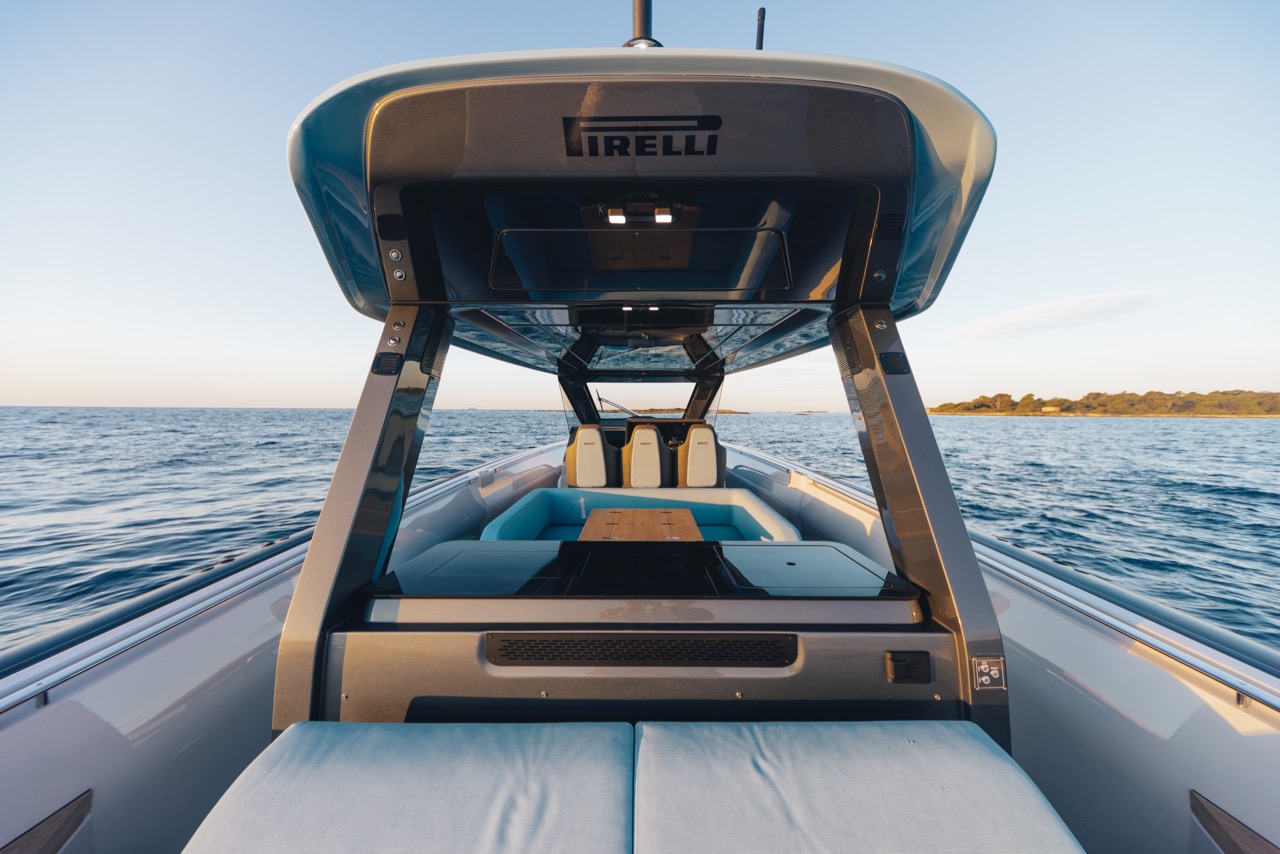 Fiel al ADN de la marca, el modelo rinde tributo al automovilismo con detalles inspirados en el mítico neumático CINTURATO Blue Full Wet de Pirelli. El diseño del dibujo de la banda de rodadura y los logotipos presentes en distintos sectores del barco refuerzan la conexión entre rendimiento, diseño y deportividad.
