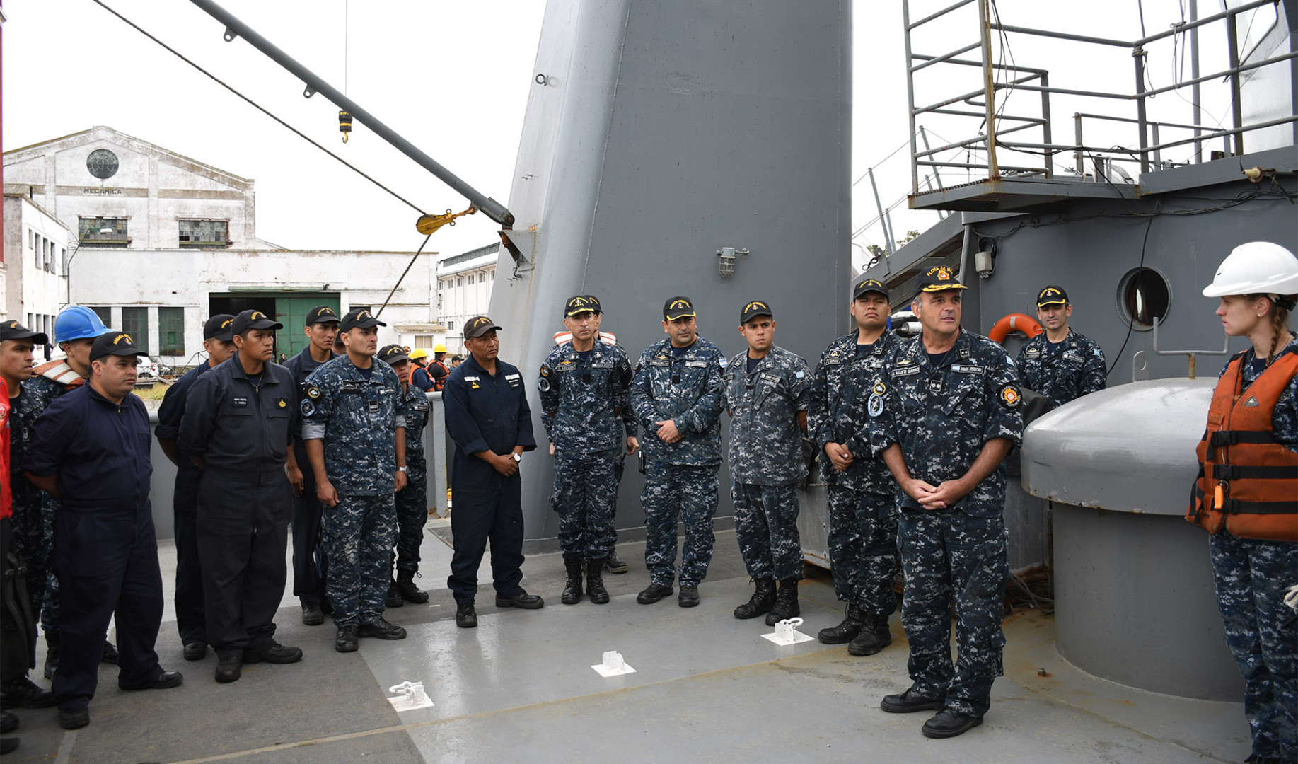 Con el acompañamiento de los acordes de la Banda de Música de la BNPB, el Comandante de la Flota de Mar, Contraalmirante José Alberto Martí Garro, embarcó para dirigirse a la tripulación, expresándoles el sentido orgullo de destacarlos como buque de estación en el Área Naval Austral.